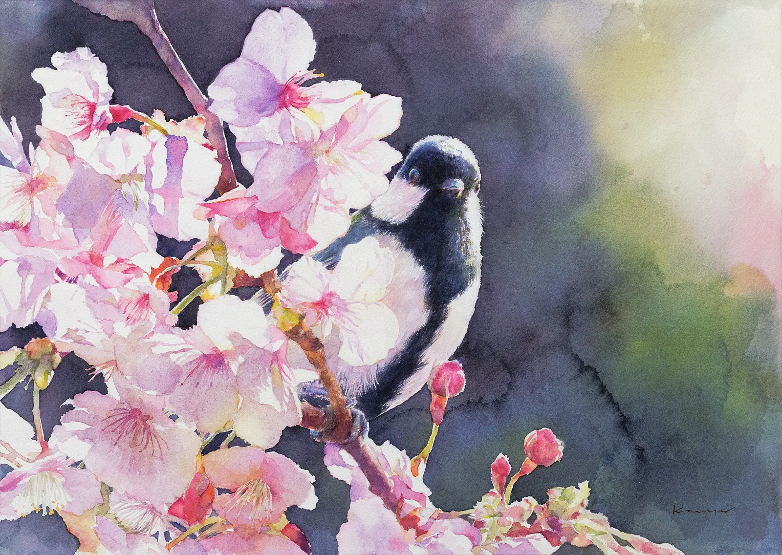 透明水彩絵具の軽やかな透明感やにじみ、重ね塗りによって生まれる色の深みに魅了され、主に小鳥や人物をモチーフに制作しています。生命の一瞬の表情や動作に宿る繊細な感情や美しさを、日本の四季と穏やかな時の流れとともに描いています。